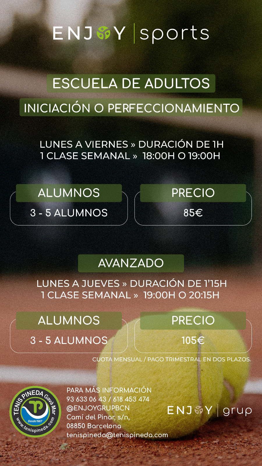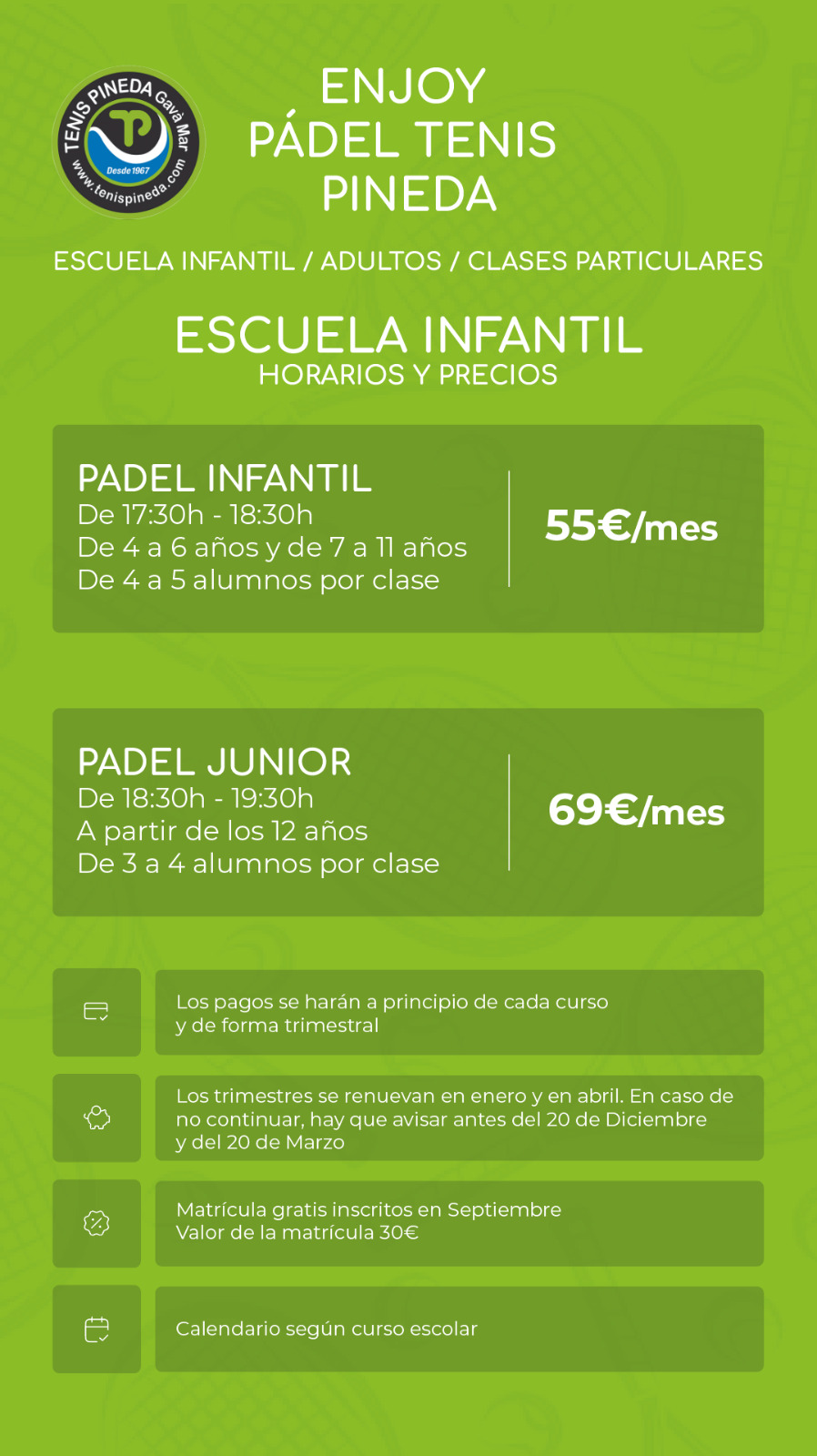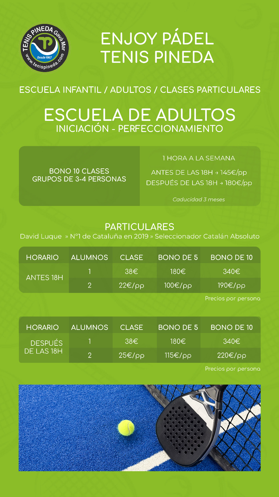 En el TENIS PINEDA GAVÀ contamos con varias escuelas, de Tenis, de Pádel (ambas divididas en categorías Infantil y de Adultos).